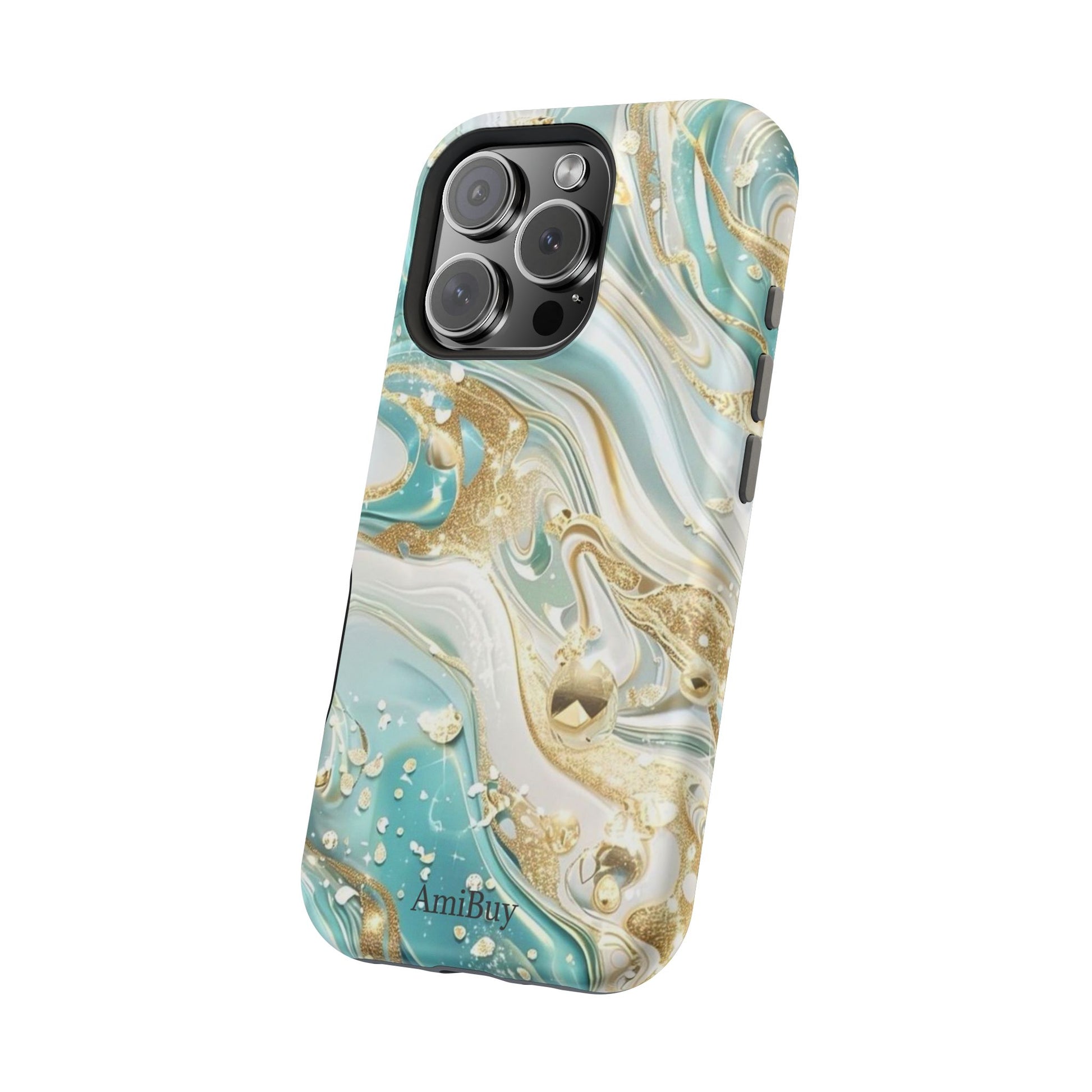 coque de téléphone brillante ou mate qui transforme la protection du quotidien en une véritable déclaration artistique. Elle enveloppe votre téléphone d’un design marbré fluide, mêlant des tourbillons de bleu sarcelle, de vert écume et d’or, qui captent la lumière comme du métal liquide.